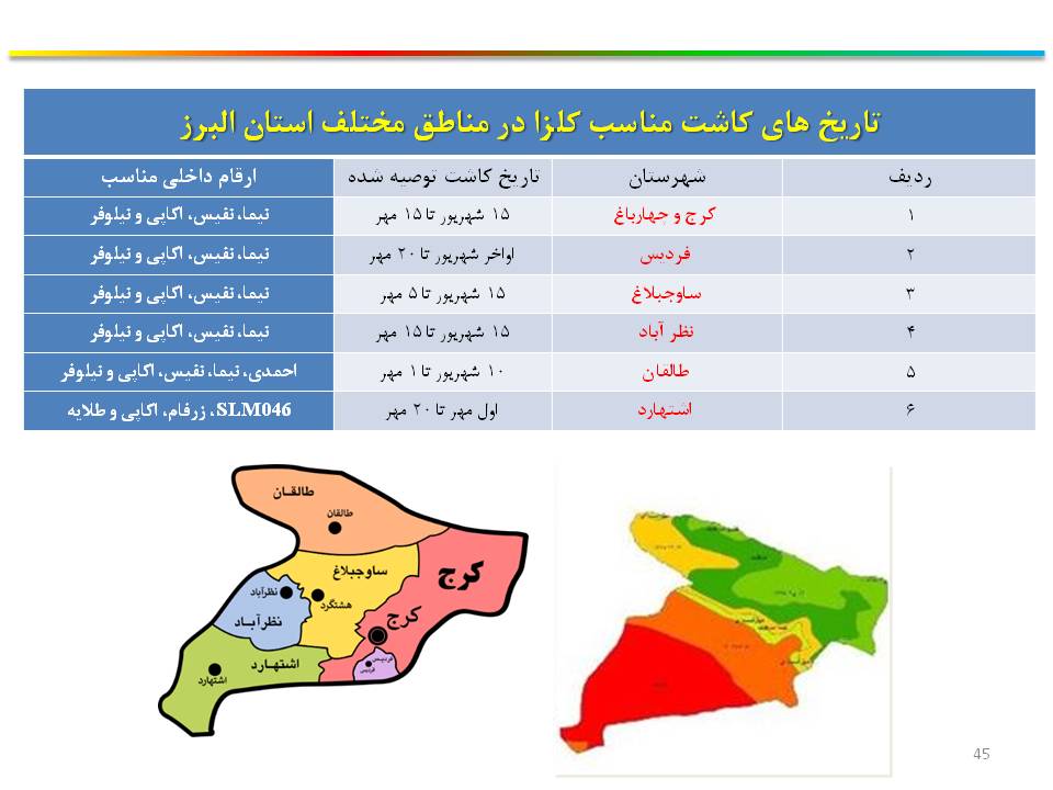 در ذیل به عنوان نمونه تاریخ کاشت و ارقام مناسب کلزا در شهرستان های استان البرز نشان داده شده است: